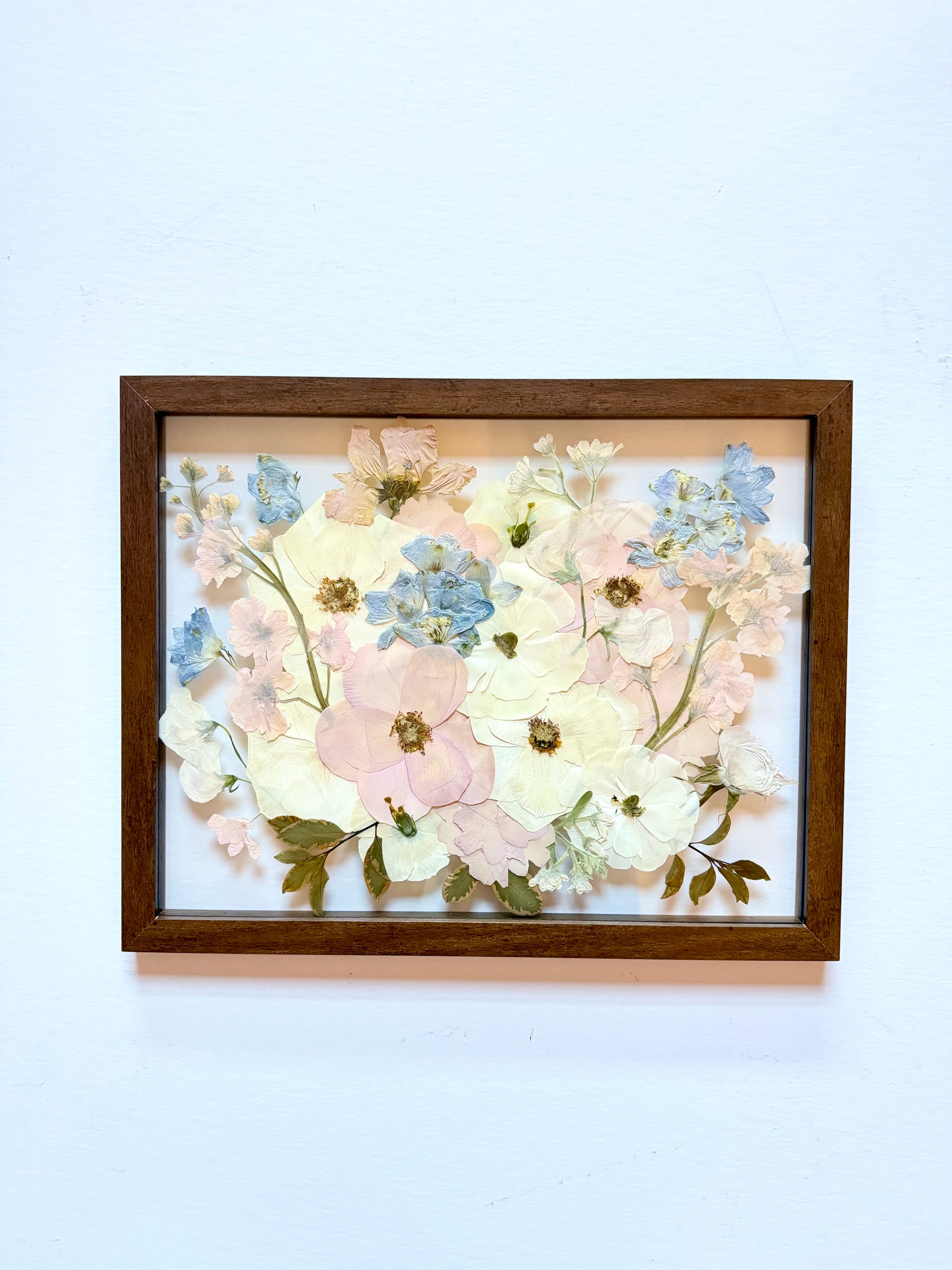 Our 11 x 14" frame is a timeless and priceless piece of art, as it will fit around one third of your bouquet. This frame will highlight just a few of your main flowers.